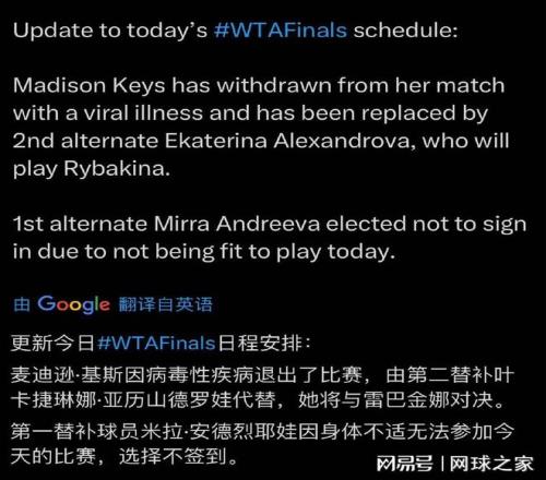 沒有意外,小組賽兩連敗的凱斯在今天賽前宣布因病毒性疾病退賽。這一突發(fā)狀況本應給予第一替補安德列娃晉級機會,然而這位俄羅斯新星因身體狀況不佳,決定放棄替補上場資格。